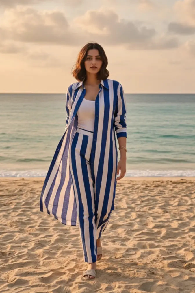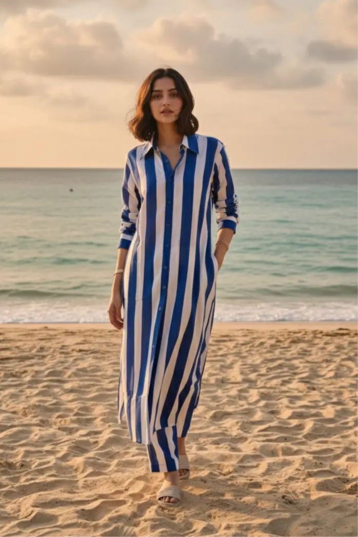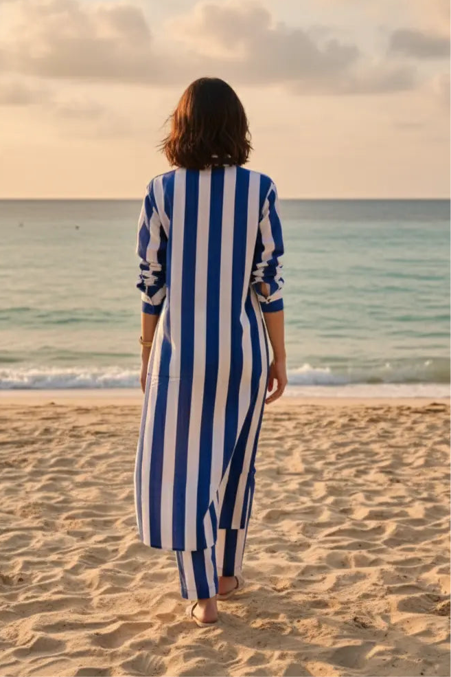 Perfect for everyday wear, work-from-home days, or vacation strolls, the fresh blue stripe pattern gives it that clean, elevated look — while staying light on your skin and your wallet.