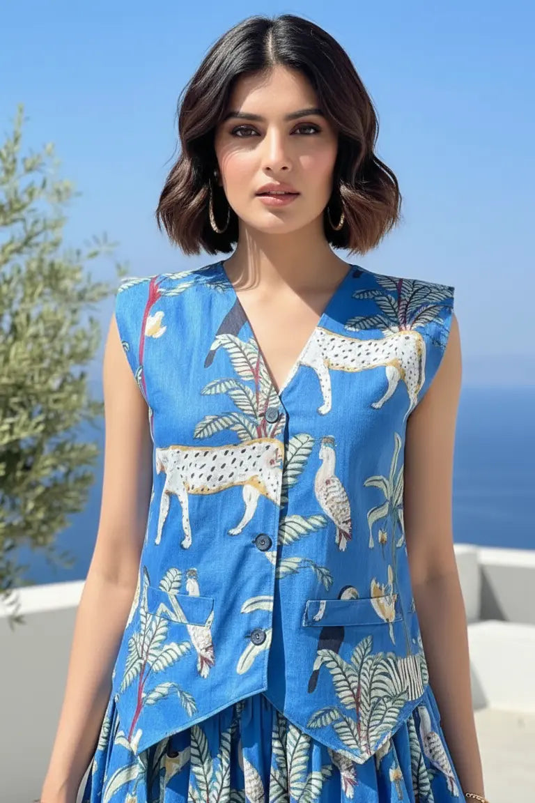 Embrace bold style with our Blue Jungle Safari Skirt & Waistcoat Set, made from 100% pure cotton. Featuring a tailored sleeveless waistcoat and flowy skirt in a striking jungle print, this lightweight co-ord is perfect for summer vacations, brunch looks, and effortless everyday wear. Stay cool, confident, and wild in this breathable cotton set.
