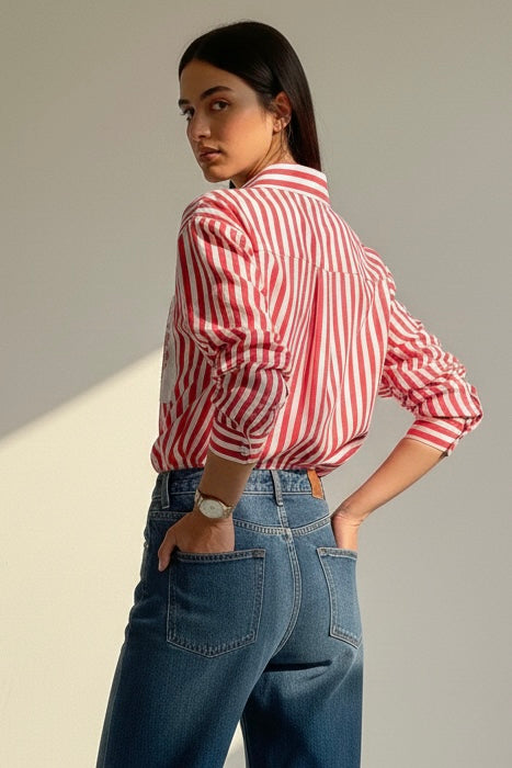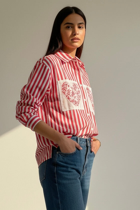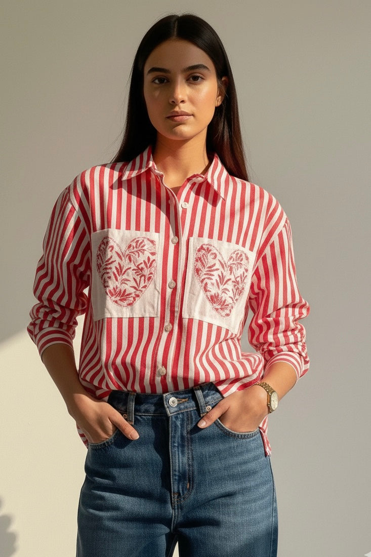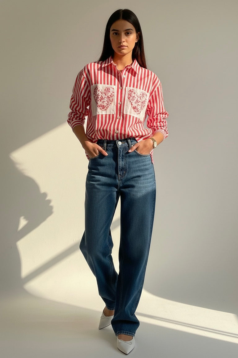 Because love is in the details 💕 Red stripes and a heart-print pocket make this the cutest Valentine must-have. Pair it with neutral tones for a chic ensemble or mix patterns for a daring, fashion-forward vibe. Every step you take in this shirt is a celebration of style, confidence, and individuality.