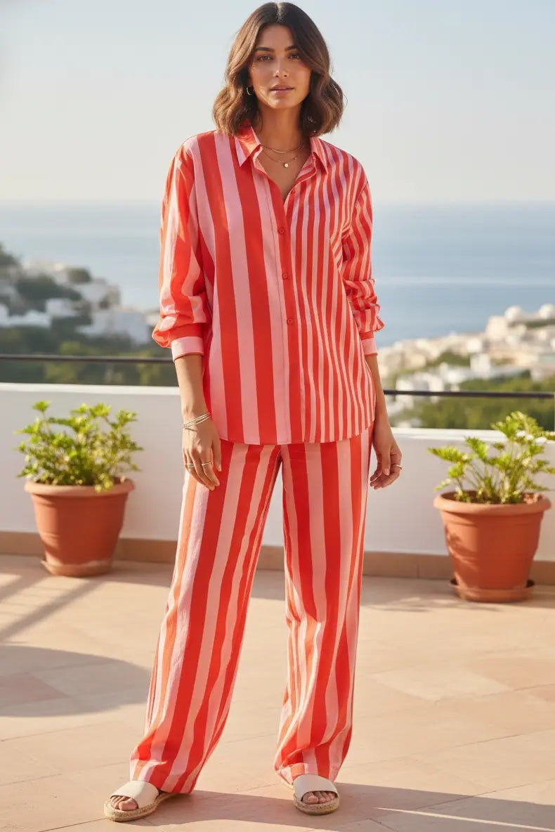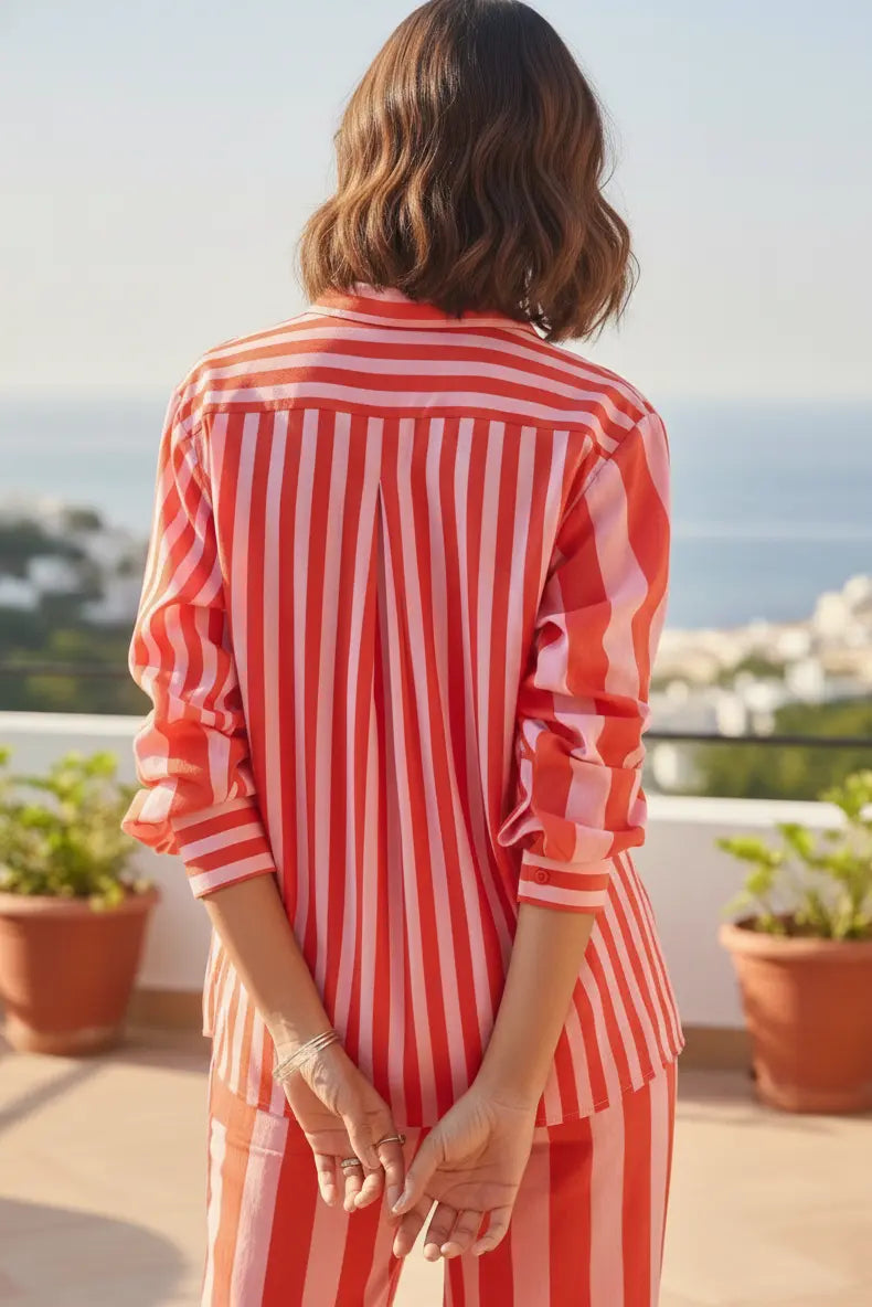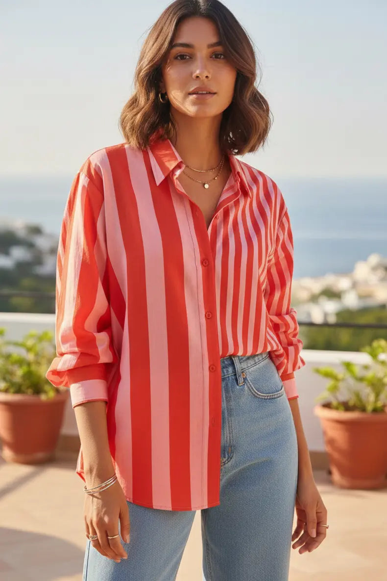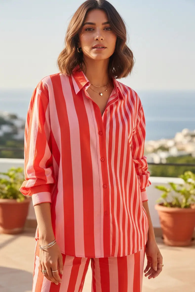 Because love is in the stipes 💕 Bold half-and-half orange stripe oversized shirt crafted for a relaxed yet statement look. Perfect for vacation styling & effortless cool-girl look.