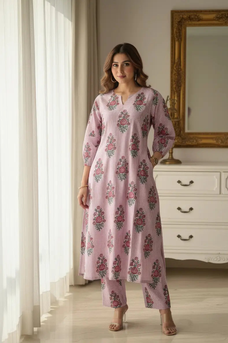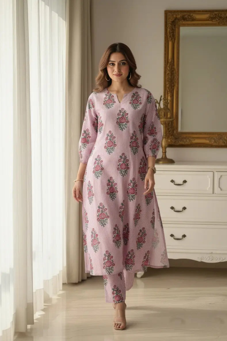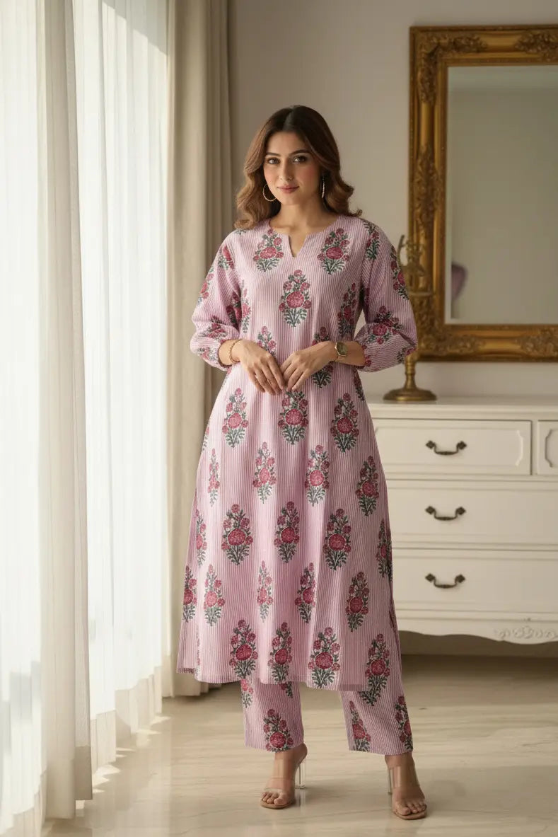 Vionna captures the romance of a pastel garden in motion. Crafted from 100% pure cotton with lilac stripes and hand-detailed poppy florals, it’s a dreamy ode to comfort and grace. Effortless, breathable, and undeniably chic — a timeless addition to your everyday elegance.